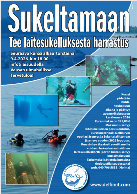 Laitesukelluksen peruskurssi alkaa keväisin maalis/huhtikuussa infotilaisuudella Vaasan uimahallissa, seuraa kerhon mainontaa kurssista somekanavilta tai näillä sivuilla.
